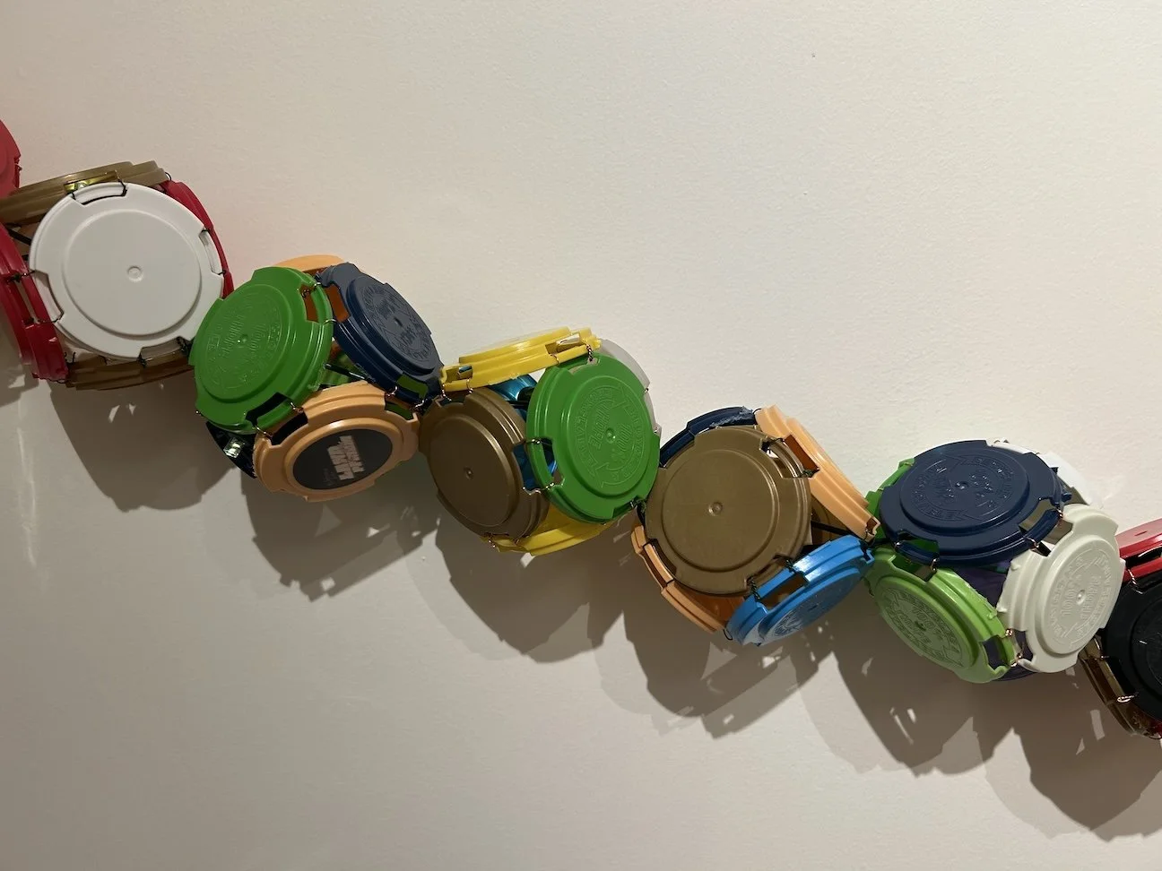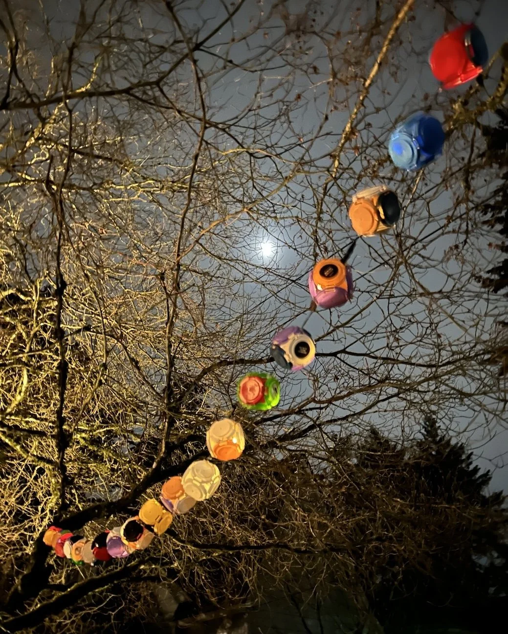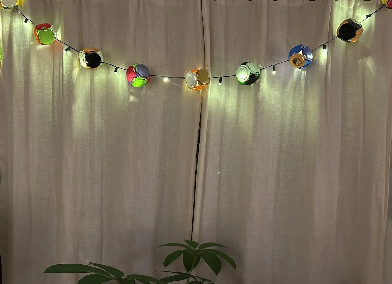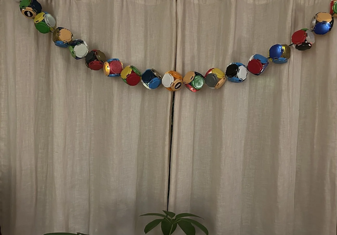 Happy-Go-Lanterns: Version 1. Interior view, 8-foot strand, crafted from recycled beer tops. Battery operated (3-AA).