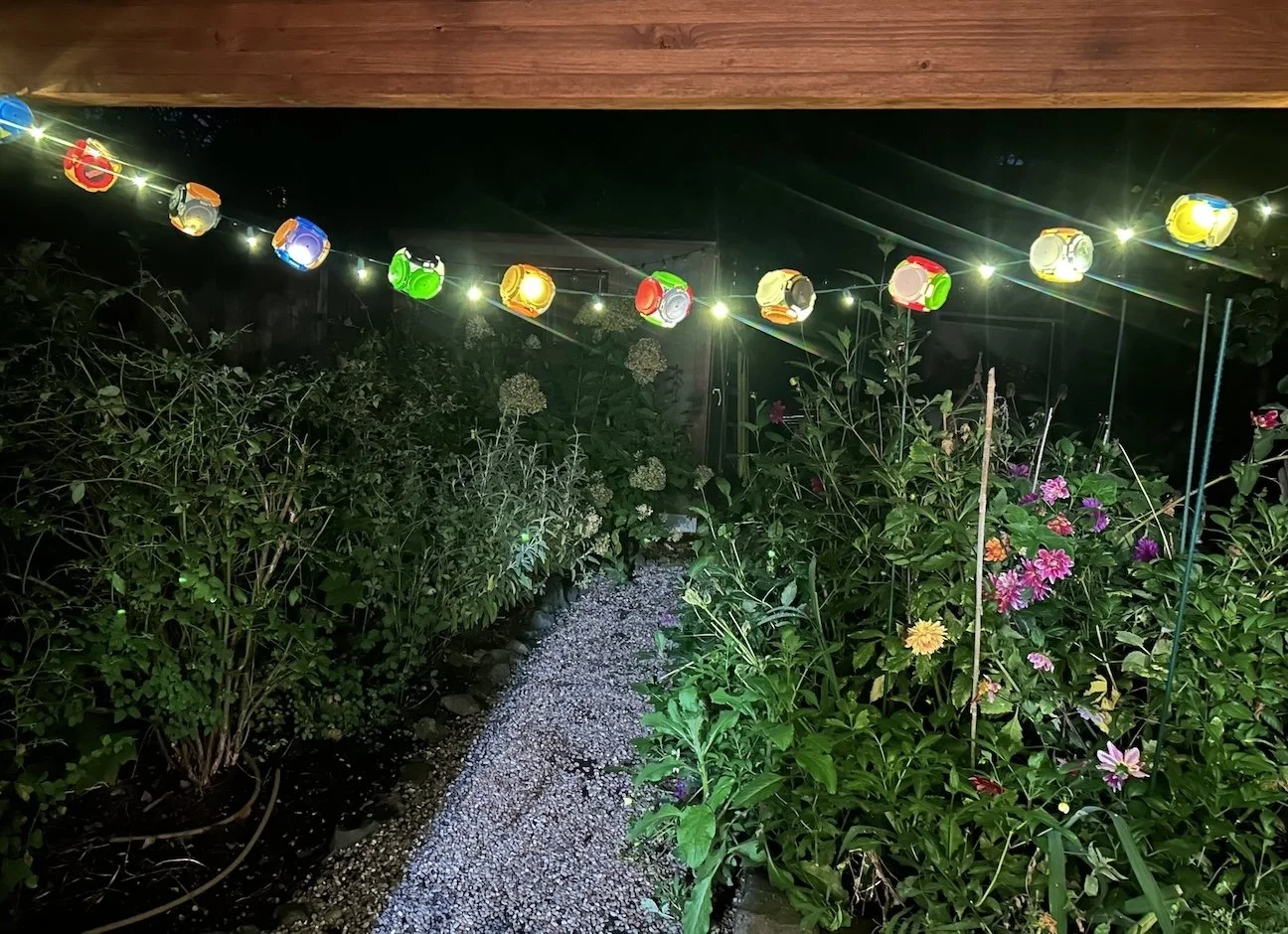 Happy-Go-Lanterns: Version 2. Outdoor night view, 8-foot strand, crafted from recycled beer tops. Battery operated (3-AA).