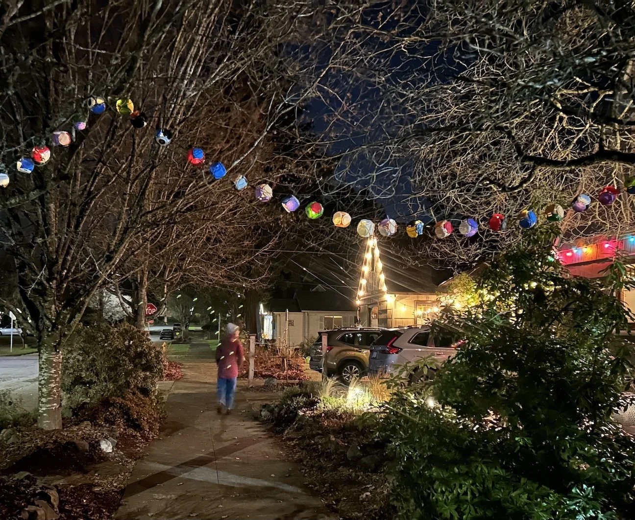 Happy-Go-Lanterns: Version 1 (24 lanterns). Outdoor night view, 8-foot strand, crafted from recycled beer tops. Battery operated (3-AA).